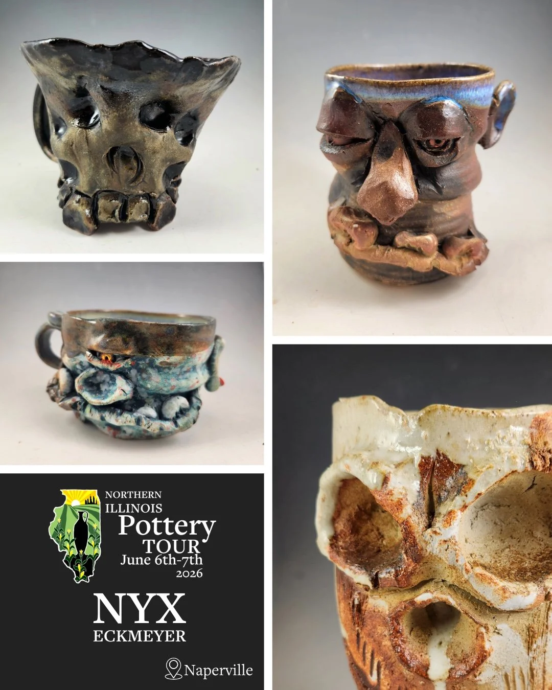 Nyx Eckmayer is interested in the interplay between sculpture, modeling, and functional ceramic work. They draw inspiration from Dungeons and Dragons, Muppets, working in the haunted house industry, alternative culture, and the American folk-art tradition of face jugs. Nyx’s work has a variety of firing styles and finishes; They strive to make each of my pieces an individual work of art. They do this to emphasize the diversity of individual experiences that make up our society.